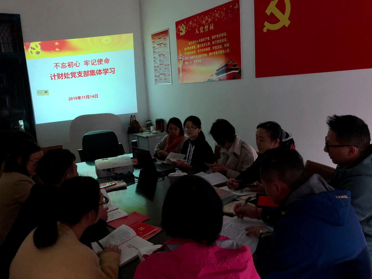 11月14日下午,计财处党员在东校区行政楼311室集体学习《习近平关于“不忘初心、牢记使命”论述摘编》第七部分即勇于自我革命,同一切影响党的先进性、弱化党的纯洁性的问题作坚决斗争。