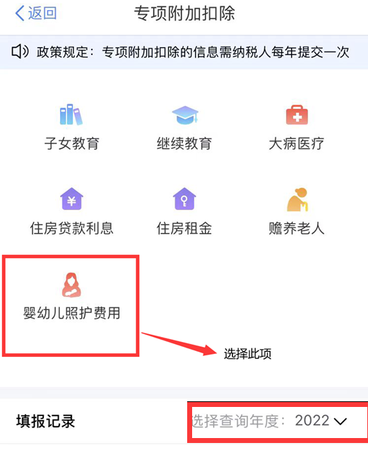 3.选择婴幼儿护理专项附加扣税,所属年份选择2022年