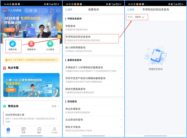 第一步:在个人所得税App首页,选择“我要查询”,选择“专项附加扣除信息查询”,再选择扣除年度“2024”;