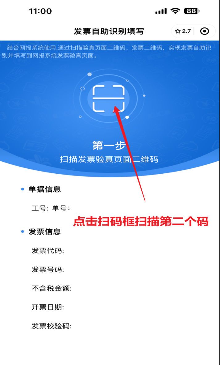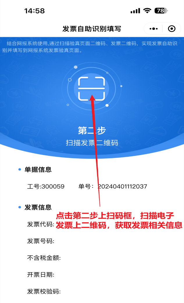 3、手机上出现发票自助识别填写后,点击手机第一步上扫码框扫描第二个二维码获取工号、单号信息;