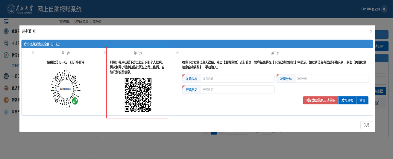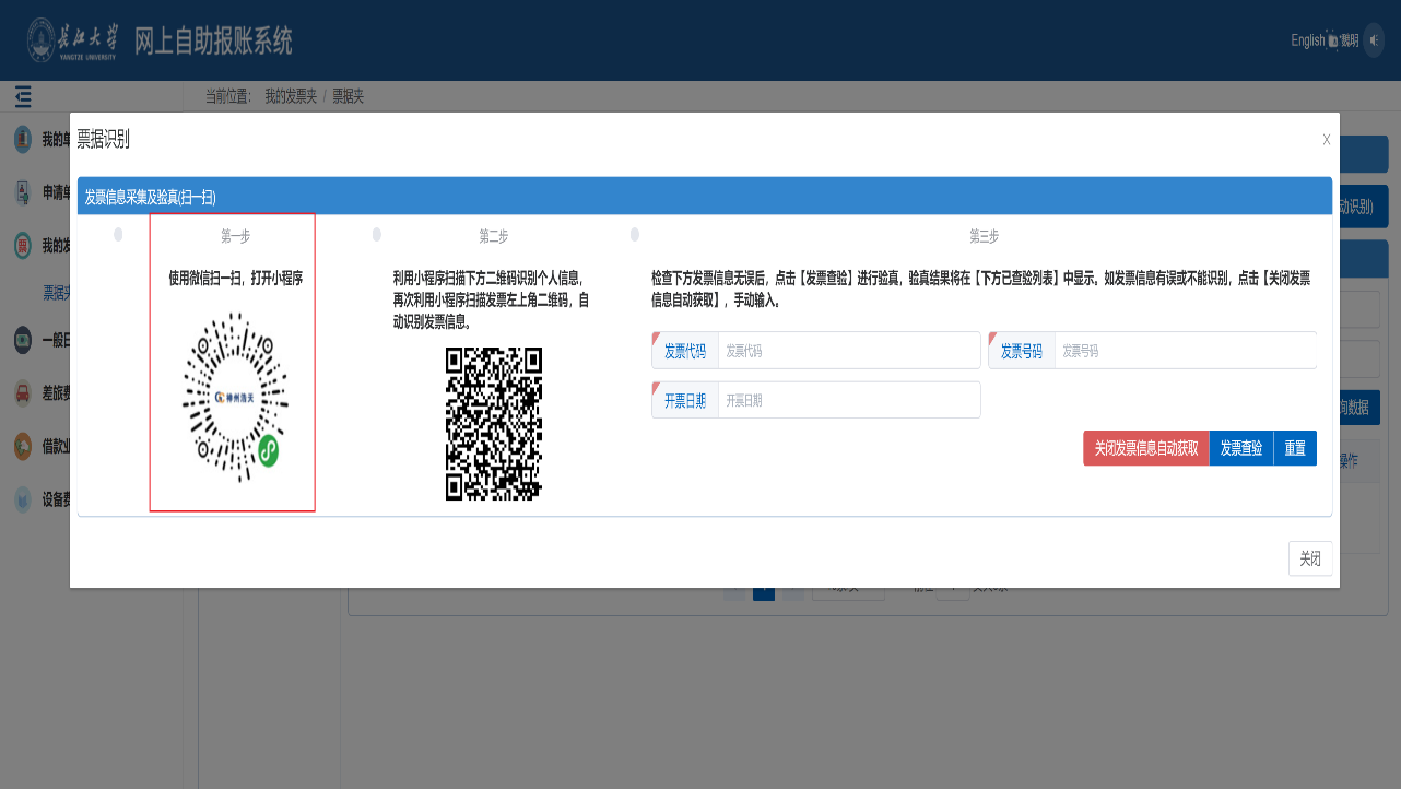 2、点击“新增发票(自动识别)”会跳出一个票据识别窗口,第一步打开手机微信扫一扫,扫描第一个图标,打开查票小程序;