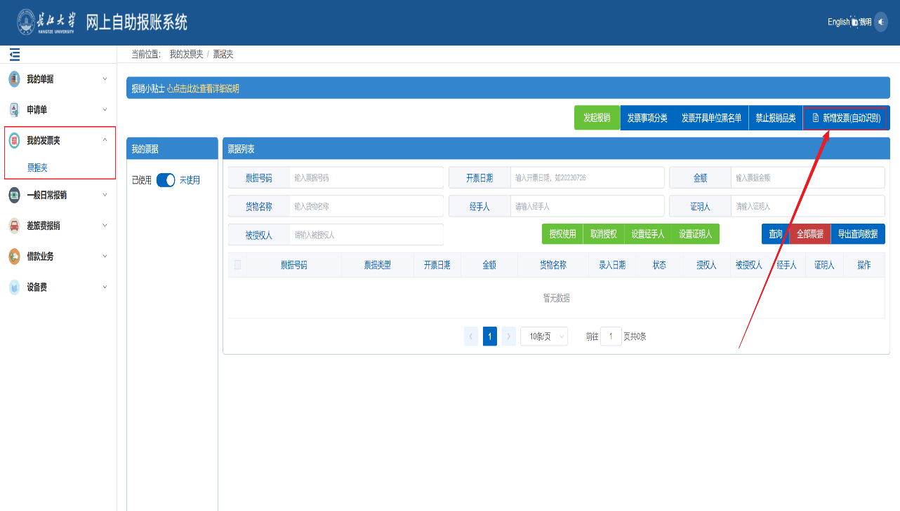 1、登陆Bevictor伟德网上自助报账系统,点击进入”我的发票夹”模块,在“票据夹”里点击“新增发票(自动识别)”;