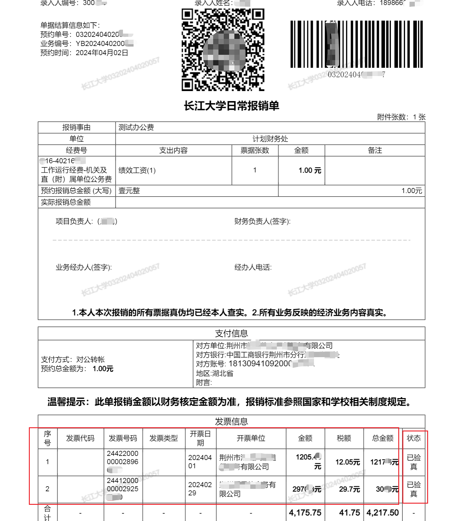 5、电子发票网上验证后,打印出的纸质网上报销单中会显示电子发票明细,请老师们将电子发票逐笔进行查验。
