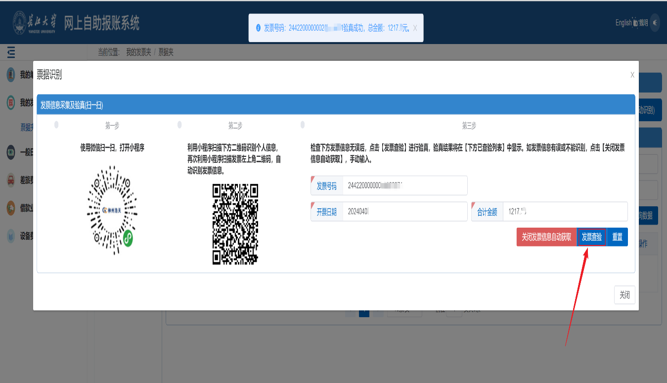 4、验证时,系统自动识别发票相关信息,便于师生核实发票真伪;