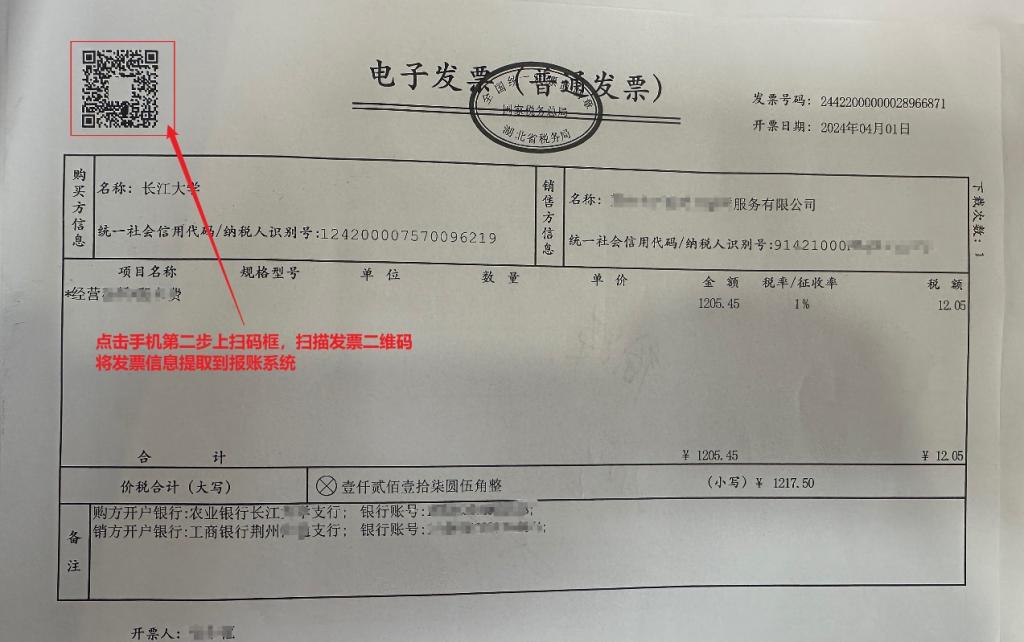 4、手机上点击发票识别填写第二步上扫码框,扫描电子发票上二维码,识别发票上相关信息;