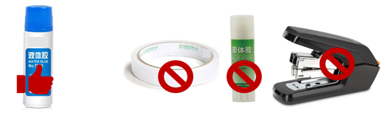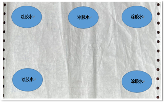 2.粘贴时将胶水均匀涂抹于票据背面五点,即票据的四个角和中间上部,保证票据平整,请勿使用胶棒、双面胶、透明胶、订书机等,尽量保证整齐均匀。