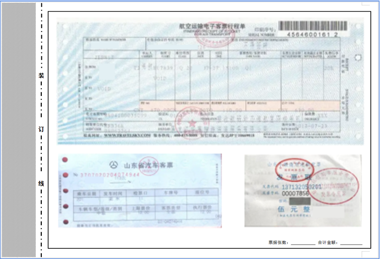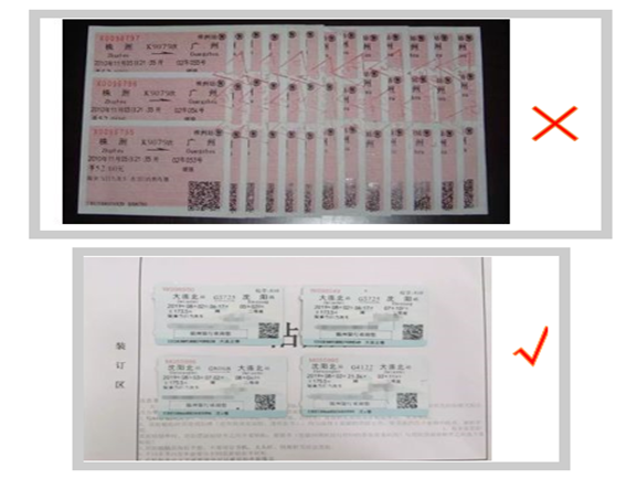 (3)小于A4纸的票据,采用单层平铺式,按照从上到下、从左到右的顺序依次粘贴,不重叠、不遮盖。强烈推荐火车票、飞机票电子行程单选择开具电子发票,并以A4纸打印进行报销。