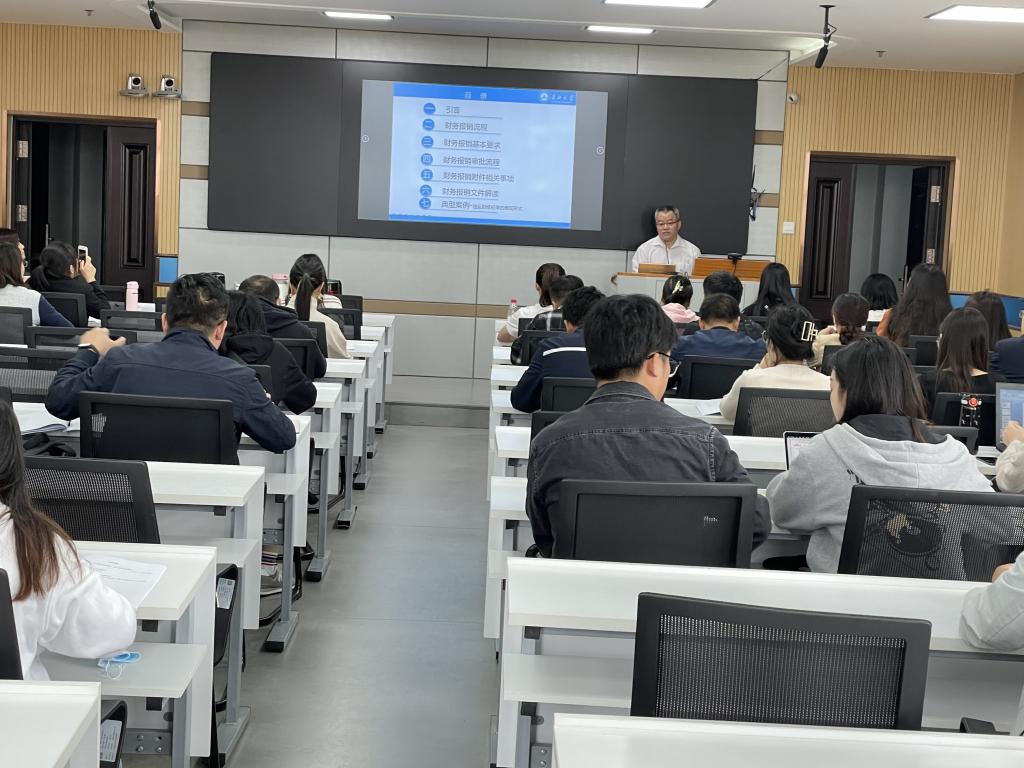 2021年10月8日下午,我处张金同副处长受教体学院邀请,在文科大楼910室为今年学校新进66名教师讲授财务报销知识。
