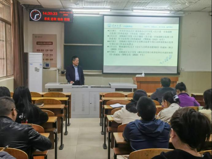 (通讯员 张珊珊)4月27日,计财处组织开展《关于进一步加强财会监督工作的意见》(以下简称《意见》)专题学习会,计财处全体教职工参会,处长唐伦刚主持。