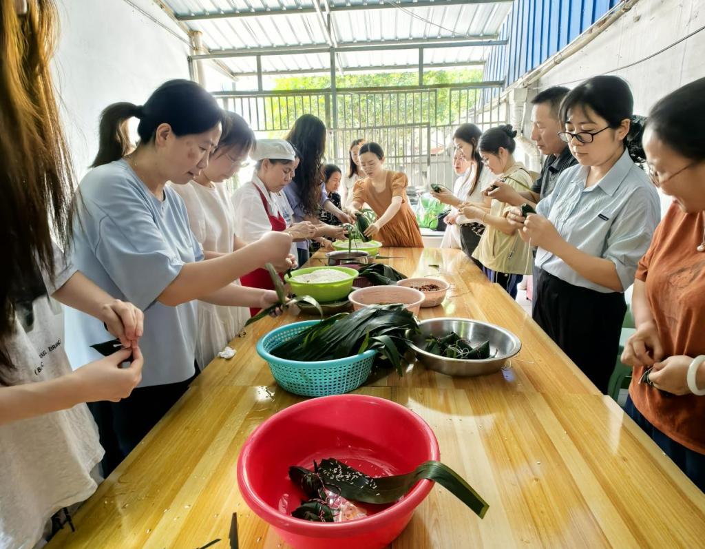 实操环节,职工们纷纷动手。大家围桌而坐,双手熟练地捋粽叶、填糯米、封口、扎捆。不一会儿,各种粽子便成型了,除常见的三角形、枕头形,还有创意的长条形、圆形、方形。大家技术虽有差异,但热情高涨,现场欢声笑语不断。造型独特的粽子还引得众人拍照称赞。