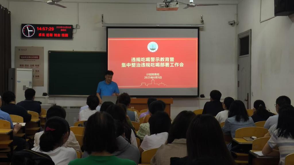 魏红梅副处长传达学习《中央层面深入贯彻中央八项规定精神学习教育工作专班、中央纪委办公厅公开通报2起党员干部违规吃喝严重违反中央八项规定精神典型问题》;余后荣副处长领学习近平总书记关于加强党的作风建设的重要论述;柳彦彬传达省、市、学校集中整治违规吃喝相关文件、会议精神。