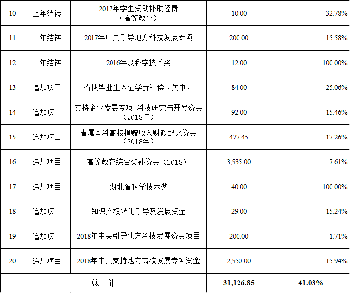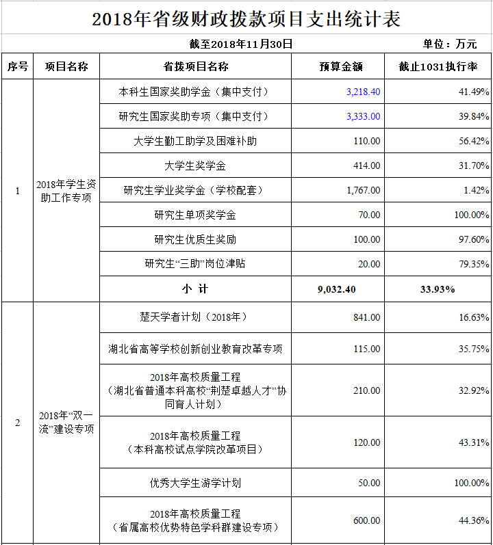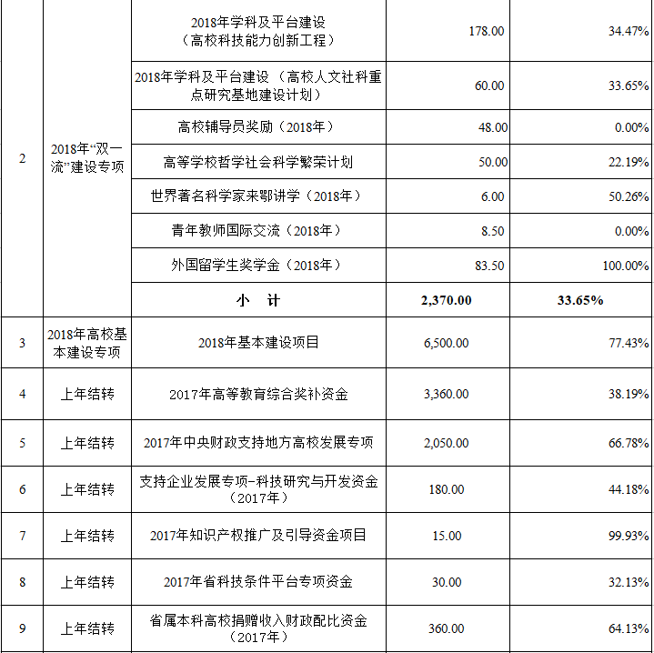 学校2018年省级财政项目支出预算经费指标31126.85万元(含预算调整),执行率为41.03%(具体见下表)。总体来看,学校预算执行进度偏慢。