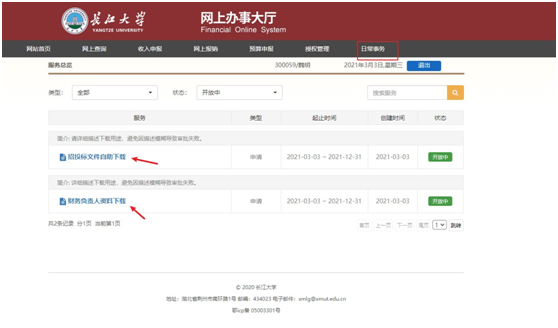 亮点3:新增对外投标基础财务资料下载功能(在日常事务模块中提交下载申请,计财处审批后,会通过“伟德国际1946”微信公众号通知申请人进行下载)